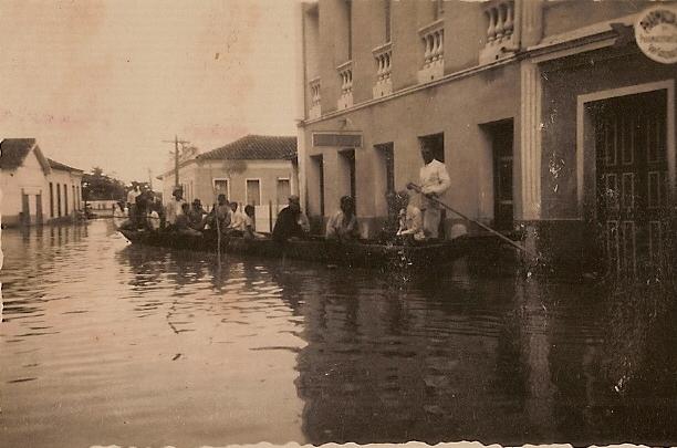As enchentes que atingiram a região como as de 1919, 1928, 1942 e 1979 forçaram a mudança dos comerciantes para a parte alta da cidade. Na foto acima, canoa em frente à tradicional Casa Telles e Farmácia Ary, Transporta mercadorias e atingidos pela enchente de 1942. Hoje, no local , está o Cinema Meninos de Araçuaí ( Foto-Arquivo Zina Chaves )